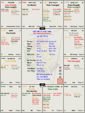 Lá số Thái Âm hãm địa tọa thủ nằm đất La Võng- Cuối đời tìm chốn vô vị Sinh ngày 19/2/1975 dương lịch lúc 19h – 21h tối Tức ngày 9/1/1975 Ất Mão giờ...