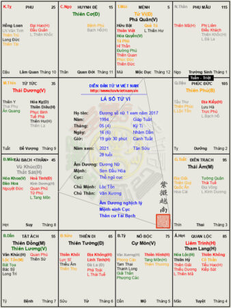 Lá số tử vi dương nữ có sao Tử Vi đắc địa, Phá Quân vượng địa cụ thế: Lá số Tử vi Dương Nữ Sinh ngày 16/05/1994 lúc 19h-21h Tức ngày: 06/04/Giáp Tuất giờ Tuất...